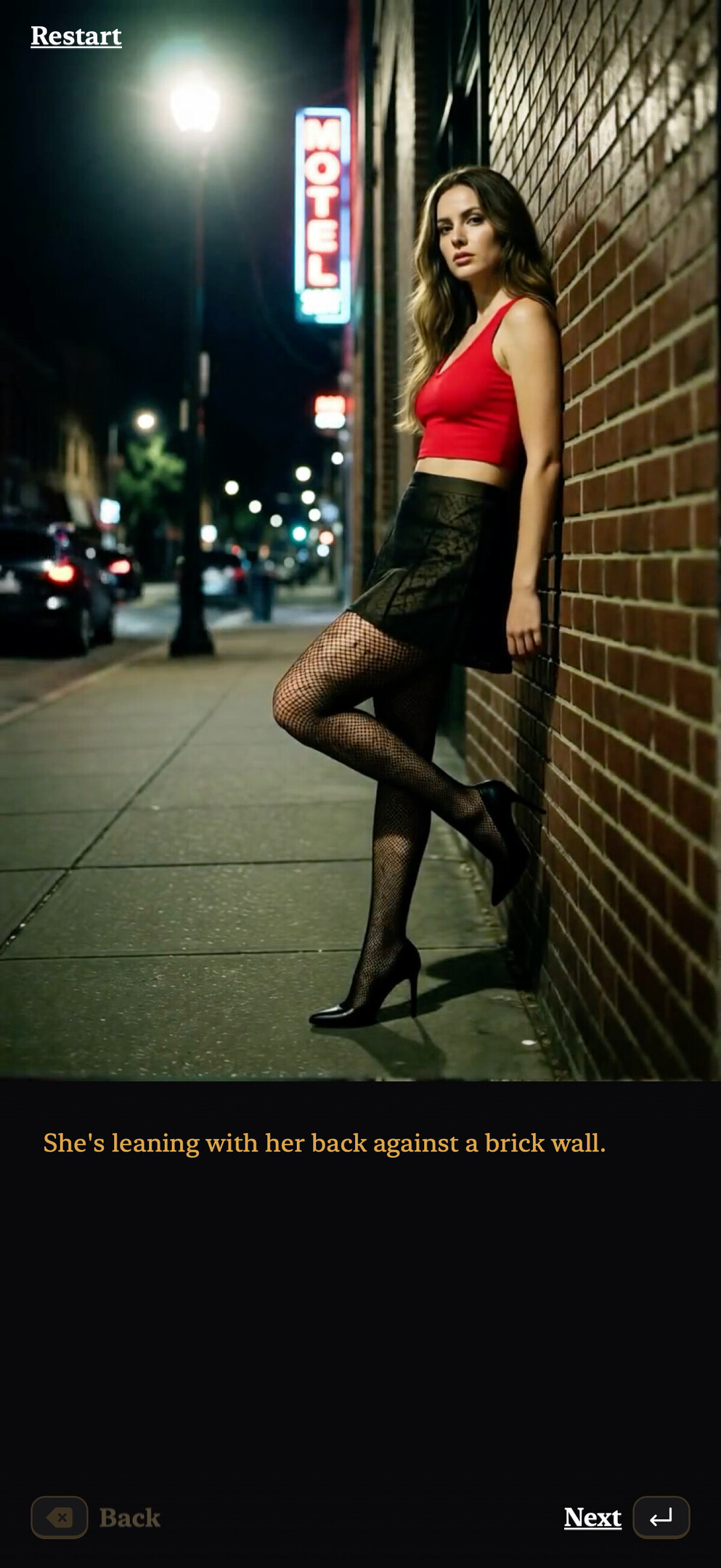 Moll is a an extremely short erotic story. It should take less than 5 minutes to complete. You chat to a hooker and take her to a motel where she gives you a blowjob and you have missionary sex. There are 19 videos and 2 images in total and you can't really miss anything of importance. All the images and videos are AI generated.