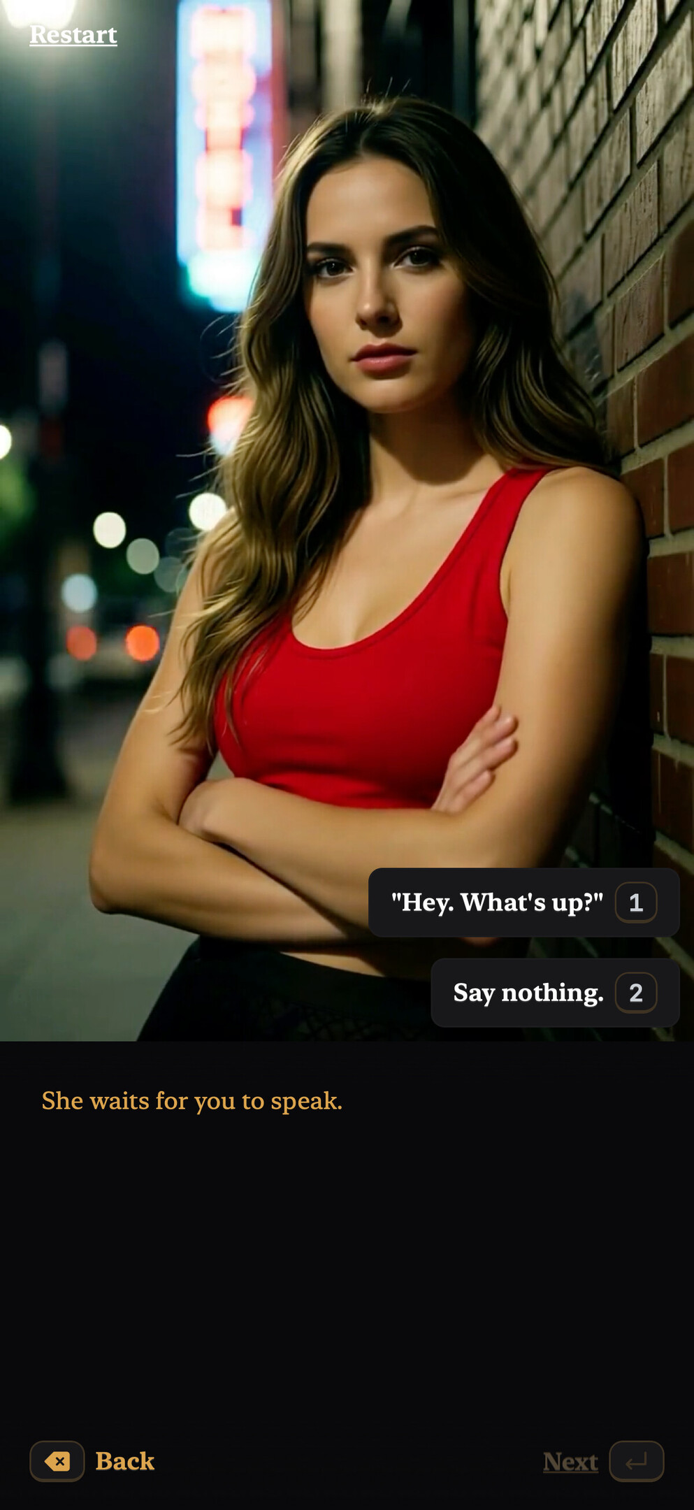 If you read this entire description, and played through, please leave a comment, even if it's to say "this is shit." I'm really curious if people are interested in this sort of thing. And feel free to leave ideas of scenes you'd like, I am open to suggestions.